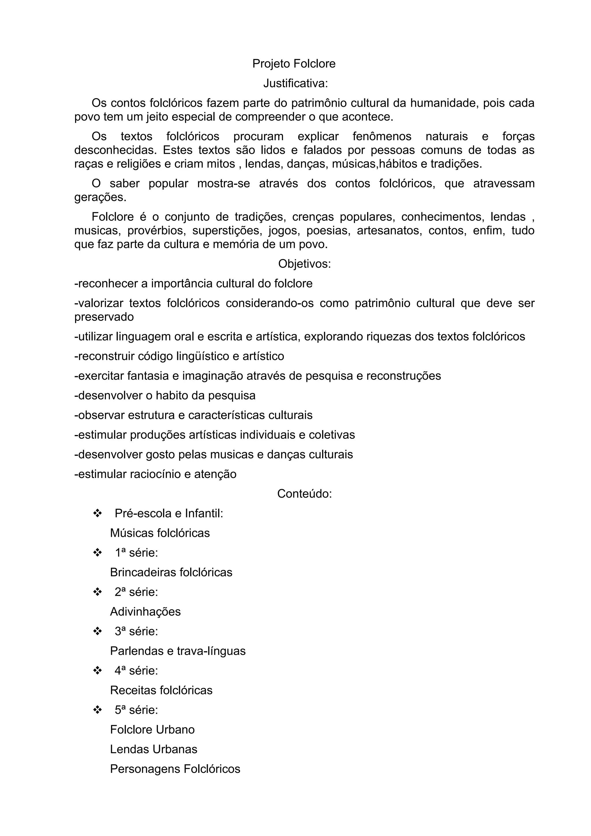 O projeto visa reconhecer a importância cultural do folclore e preservar o patrimônio cultural contido nos contos folclóricos. Os objetivos incluem valorizar os textos folclóricos, desenvolver habilidades linguísticas e artísticas por meio de pesquisas e reconstruções, e estimular a criatividade e o raciocínio das crianças. O conteúdo abordará músicas, brincadeiras, adivinhações, parlendas e receitas folclóricas de acordo com a série escolar.