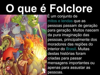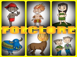 O documento descreve vários mitos e lendas folclóricas brasileiras, incluindo a Boitatá, representada por uma cobra de fogo protetora da natureza; o Boto, que encanta mulheres e as leva para o rio; e o Saci-Pererê, um menino negro de um só pé que prega peças.