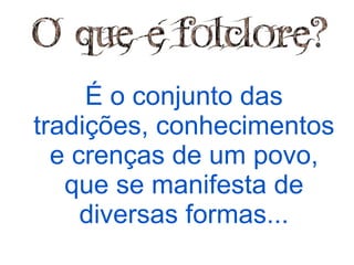 O documento descreve diferentes aspectos do folclore brasileiro, incluindo seres fantásticos como o Saci-Pererê e o Lobisomem, além de lendas, contos, poesia popular, ditados, trava-línguas e brincadeiras como parlendas que refletem a sabedoria do povo.