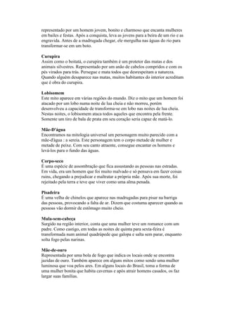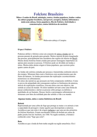 Este documento descreve vários mitos e lendas do folclore brasileiro, incluindo o Boitatá, representado como uma cobra de fogo protetora da natureza; o Curupira, um anão de cabelos compridos que protege a floresta; e o Saci-Pererê, um menino negro travesso com uma perna só. Além disso, fornece detalhes sobre o Dia do Folclore comemorado no Brasil e a influência desse folclore na cultura popular.