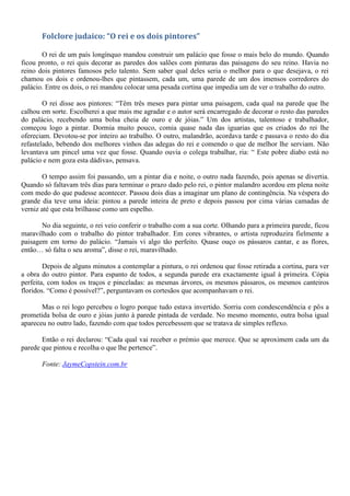O rei de um país longínquo contratou dois pintores famosos para decorar seu novo palácio. Um pintor trabalhou arduamente enquanto o outro procrastinou. No último dia, o pintor preguiçoso pintou a parede de preto e cobriu com verniz para simular o trabalho do outro. Quando o rei viu as pinturas, percebeu o logro do segundo pintor através da inversão da imagem no reflexo e recompensou cada um de acordo com seu mérito.