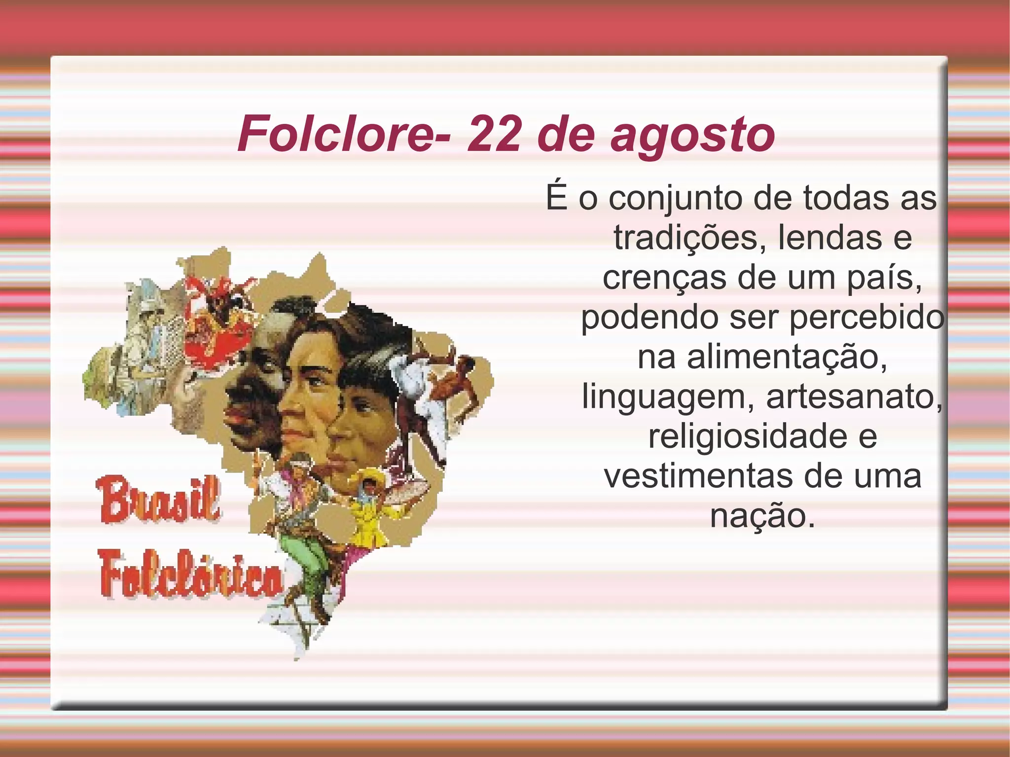 Folclore- 22 deagosto É o conjunto de todas as tradições, lendas e crenças de um país, podendo ser percebido na alimentação, linguagem, artesanato, religiosidade e vestimentas de uma nação.