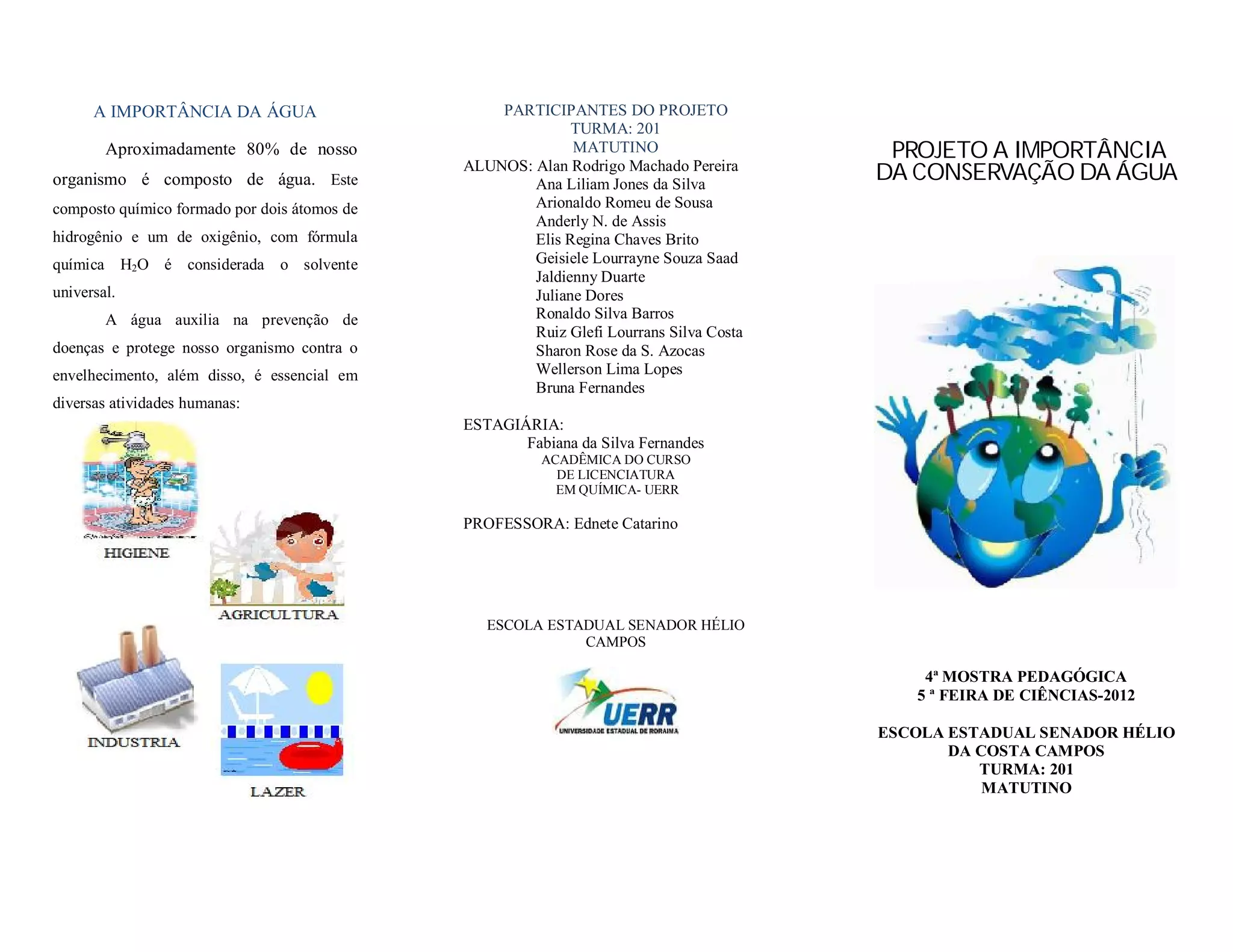 O documento descreve o projeto de uma turma de ensino médio sobre a importância da conservação da água. O projeto inclui o ciclo da água, fontes de contaminação, efeitos da contaminação e dicas para preservação da água. A turma é composta por 20 alunos e uma estagiária sob a supervisão de uma professora.