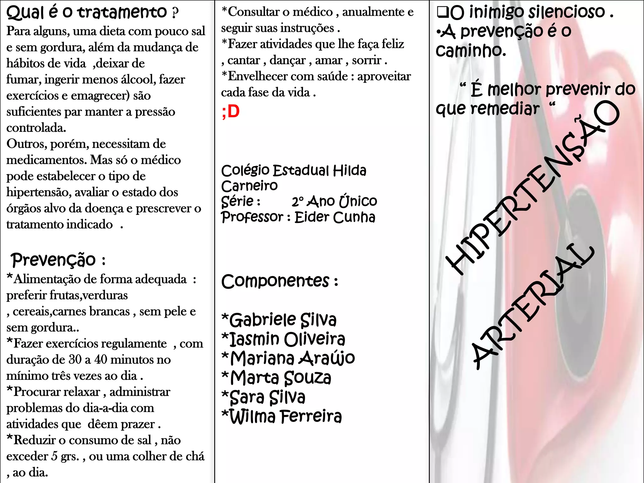 O documento discute o tratamento da hipertensão arterial. Para alguns pacientes, mudanças no estilo de vida como dieta saudável e exercícios podem controlar a pressão. Outros pacientes precisam de medicamentos prescritos por um médico para tratar a condição e proteger os órgãos. A prevenção envolve hábitos saudáveis de alimentação, atividade física, redução do estresse e consultas médicas regulares.