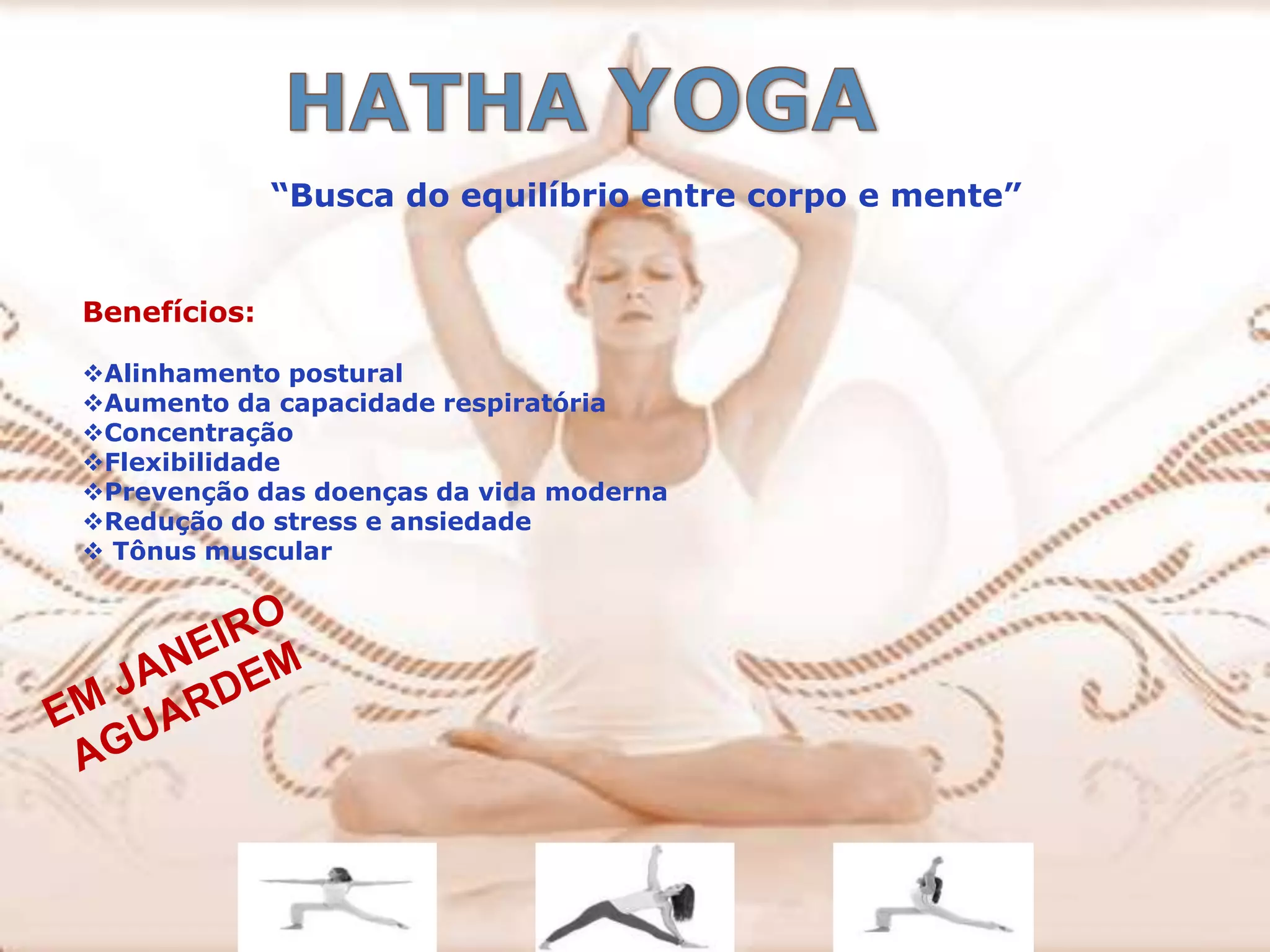 O documento discute os benefícios de buscar o equilíbrio entre corpo e mente, incluindo melhor alinhamento postural, capacidade respiratória e flexibilidade, além de prevenção de doenças, redução do estresse e ansiedade, e melhora do tônus muscular.