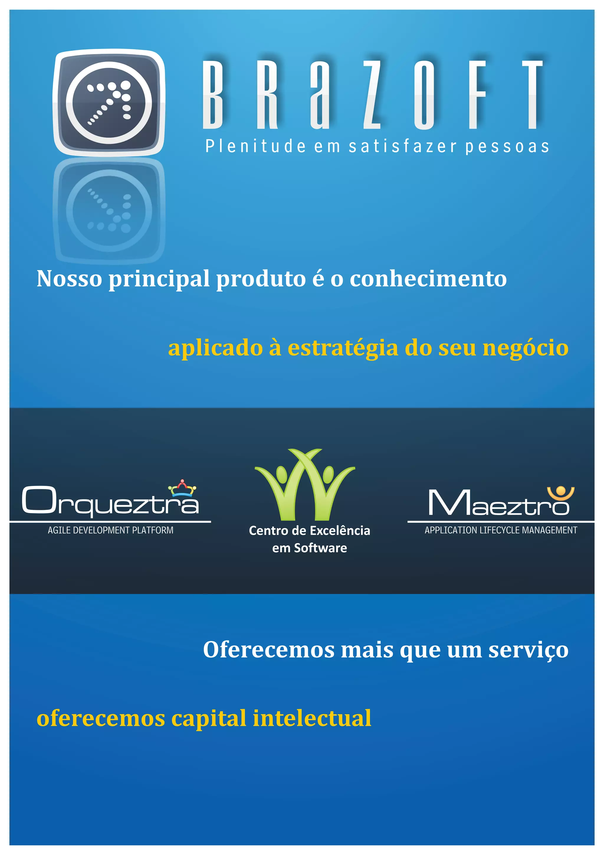 O documento descreve a plataforma de desenvolvimento ágil Orqueztra da empresa BRAZOFT, que fornece componentes, aplicativos e integrações para auxiliar equipes de TI a atender requisitos de negócio de forma ágil. A plataforma também inclui a ferramenta Maeztro para gestão do ciclo de vida de aplicativos, que melhora o processo de desenvolvimento tornando-o mais estável, colaborativo e rentável.