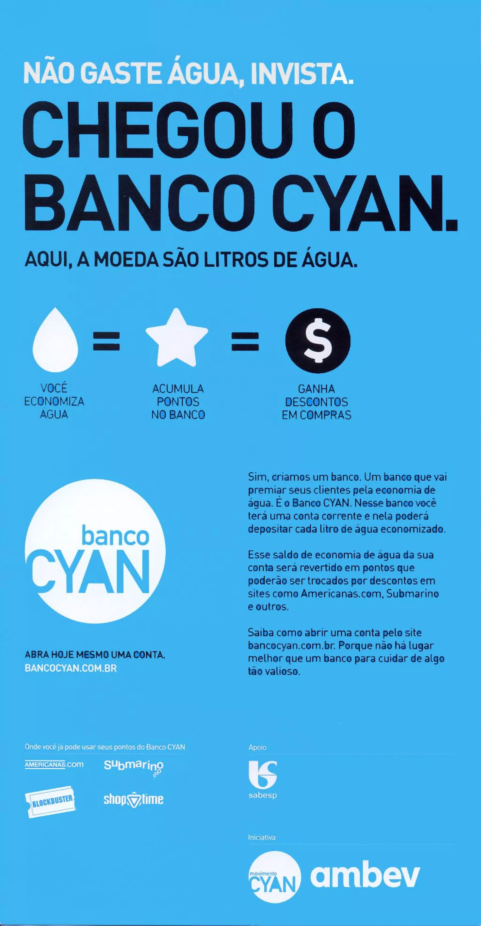 Para celebrar o Dia Mundial da Água, a Ambev realizou em 22/03/11, em São Paulo, um evento que reuniu nomes nacionais e internacionais, entre especialistas, pesquisadores e representantes do governo da sociedade civil. O debate aconteceu em um espaço reservado dentro da mega exposição Água na Oca, instalada no Parque do Ibirapuera - mostra que tem a Ambev como uma das patrocinadoras. O Movimento CYAN é uma campanha lançada pela Ambev em março de 2010 para mobilizar a sociedade sobre a importância do uso racional da água. A campanha, feita pela Loducca, incluiu peças em dois dos principais jornais de São Paulo - O Estado de São Paulo e Folha de São Paulo.