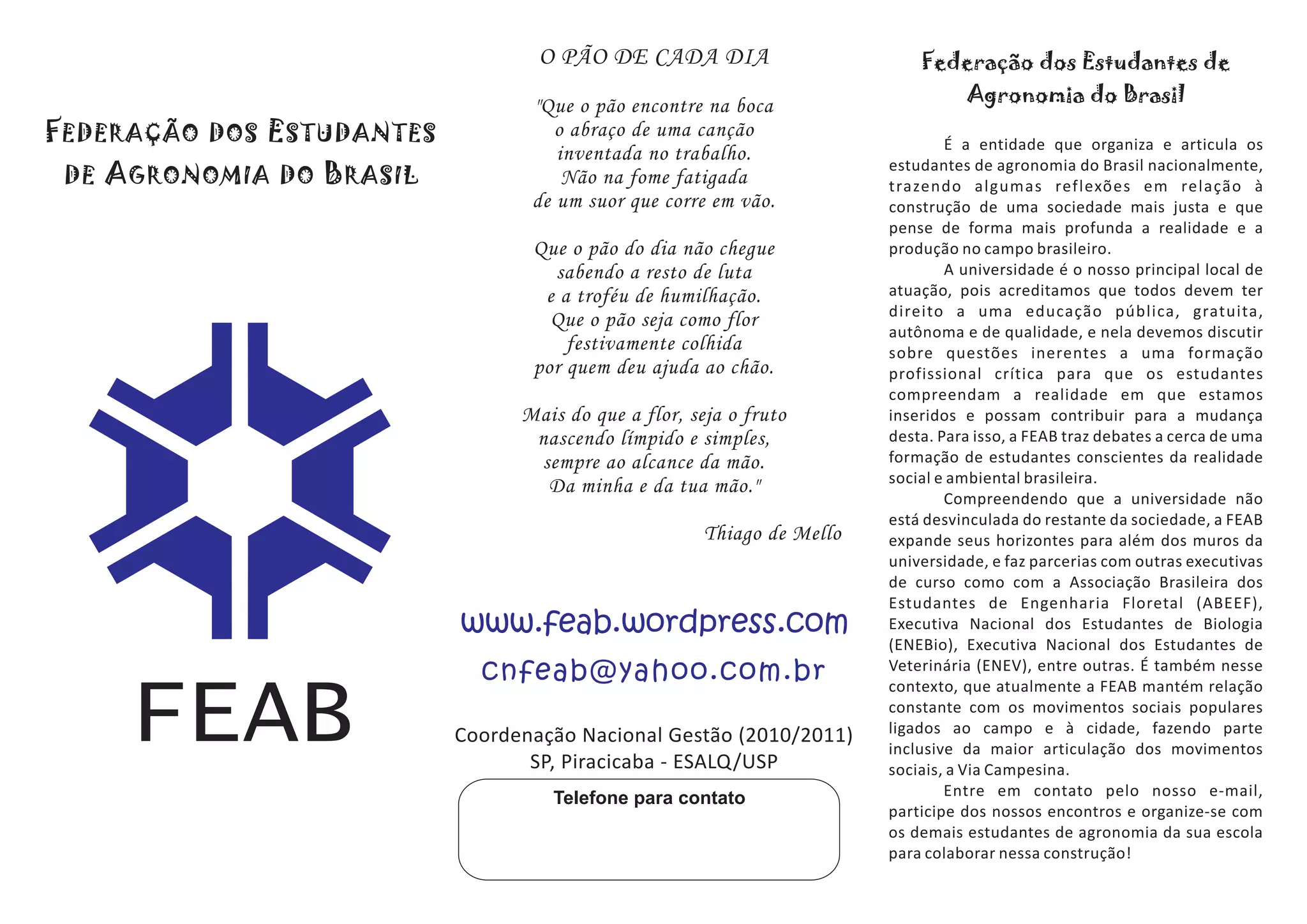 O documento descreve a Federação dos Estudantes de Agronomia do Brasil (FEAB), que organiza e representa estudantes de agronomia nacionalmente. A FEAB defende o direito à educação pública e gratuita e realiza debates sobre formação profissional crítica. Além disso, a FEAB se relaciona com movimentos sociais populares e outras entidades estudantis para discutir questões agrícolas e sociais.