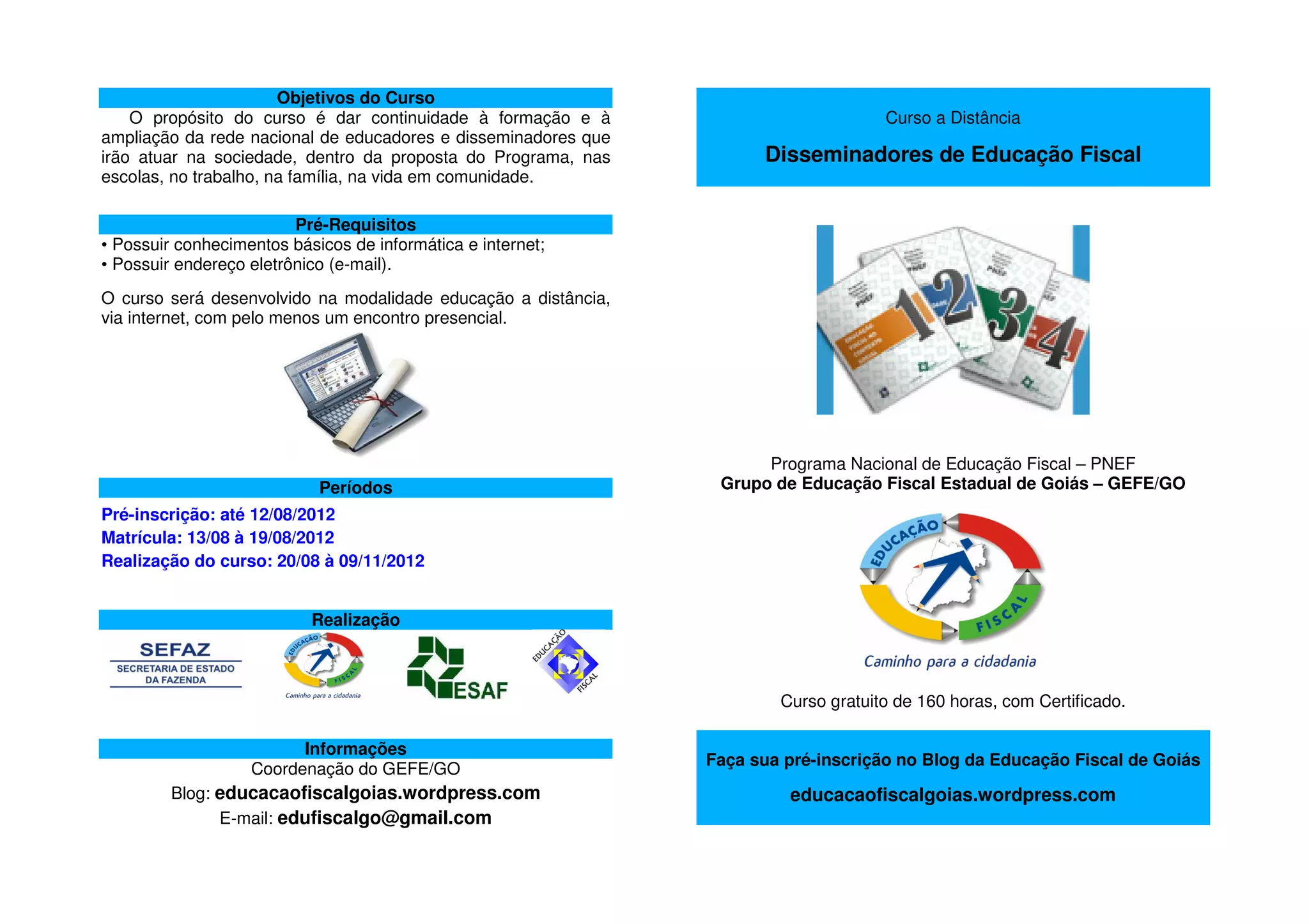 O documento descreve um curso gratuito de 160 horas para disseminadores da Educação Fiscal no estado de Goiás. O curso será oferecido a distância com um encontro presencial e abordará tópicos como o papel da educação fiscal na sociedade, a relação entre estado e sociedade, a função social dos tributos e a gestão democrática dos recursos públicos. O objetivo é formar educadores capazes de ensinar conceitos fiscais e promover a cidadania.