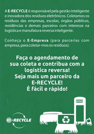 A AE-RECYCLE é uma empresa responsável pela gestão inteligente e inovadora de resíduos eletrônicos, coletando esses resíduos de empresas, escolas, órgãos públicos e residências. Eles possuem profissionais especializados no gerenciamento de resíduos eletrônicos de forma inteligente e inovadora para empresas interessadas na logística reversa. A legislação brasileira determina que fabricantes, importadores e distribuidores de produtos eletrônicos e seus componentes devem estruturar sistemas de log