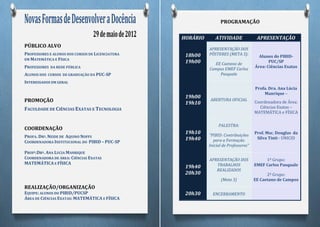 Este documento anuncia o II Simpósio Interno do PIBID da PUC-SP das áreas de Ciências Exatas, com o objetivo de analisar a formação inicial de professores e apresentar os trabalhos realizados no âmbito do Subprojeto Ciências Exatas. O evento ocorrerá no dia 18 de maio das 18h às 20h30 na sala 20 do Prédio II da PUC-SP e contará com a apresentação de pôsteres, palestra e apresentações dos trabalhos dos alunos do PIBID.