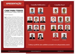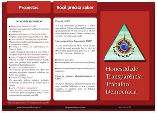 Este documento propõe mudanças na gestão da Caixa Bene cente da PMDF, como permitir que qualquer associado possa ser Diretor Executivo e criar um portal de transparência para os associados acompanharem os atos administrativos. A chapa CABE PARA TODOS se candidata prometendo inovação, democracia e respeito aos policiais militares.