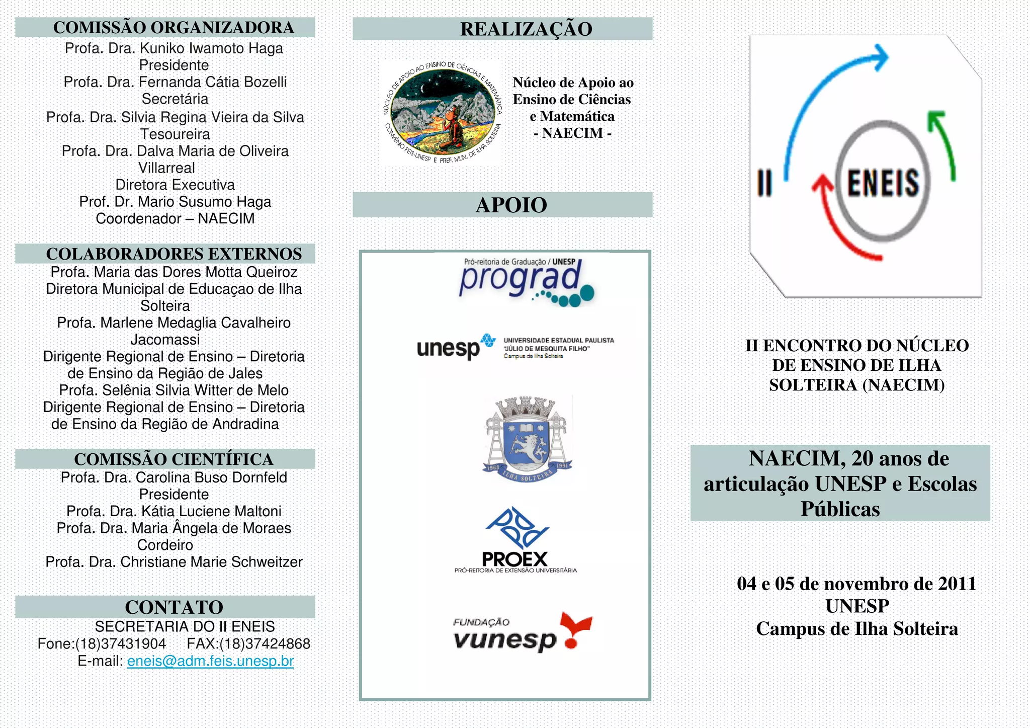 Este documento fornece a programação do II Encontro do Núcleo de Ensino de Ilha Solteira (NAECIM), que ocorrerá nos dias 4 e 5 de novembro de 2011 na UNESP de Ilha Solteira. A programação inclui oficinas, mesas redondas, apresentação de pôsteres e palestras sobre temas como recursos didáticos, avaliação escolar e formação de professores. O evento celebra os 20 anos de parceria entre o NAECIM e escolas públicas.