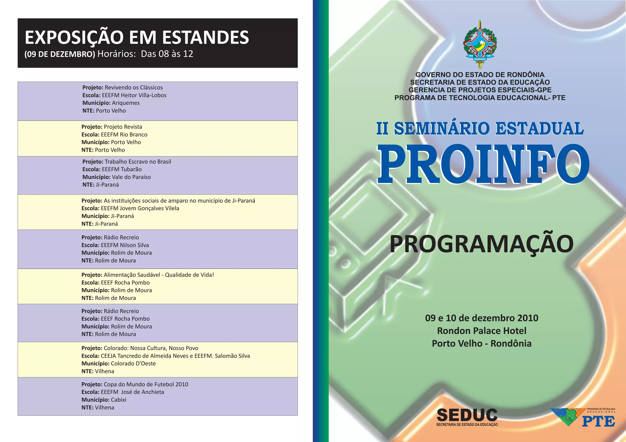 [1] O documento descreve a programação do II Seminário Estadual do Proinfo 2010 em Porto Velho, Rondônia. [2] Durante o evento, projetos educacionais de escolas de várias cidades serão apresentados em estandes e ocorrerão oficinas sobre softwares educacionais. [3] A programação inclui palestras, apresentações de trabalhos, visitas a estandes e oficinas sobre temas como Hot Potatoes, Stop-Motion, Camtasia e outros.