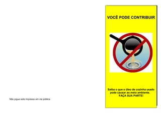O documento discute os danos ambientais causados pelo descarte inadequado de óleo de cozinha e incentiva o reaproveitamento deste óleo através da coleta em locais específicos. Cada litro de óleo descartado de forma incorreta polui um milhão de litros de água. O documento lista locais de coleta em Vitória e menciona que o óleo recolhido é usado na produção de itens como tintas, sabão e biodiesel.