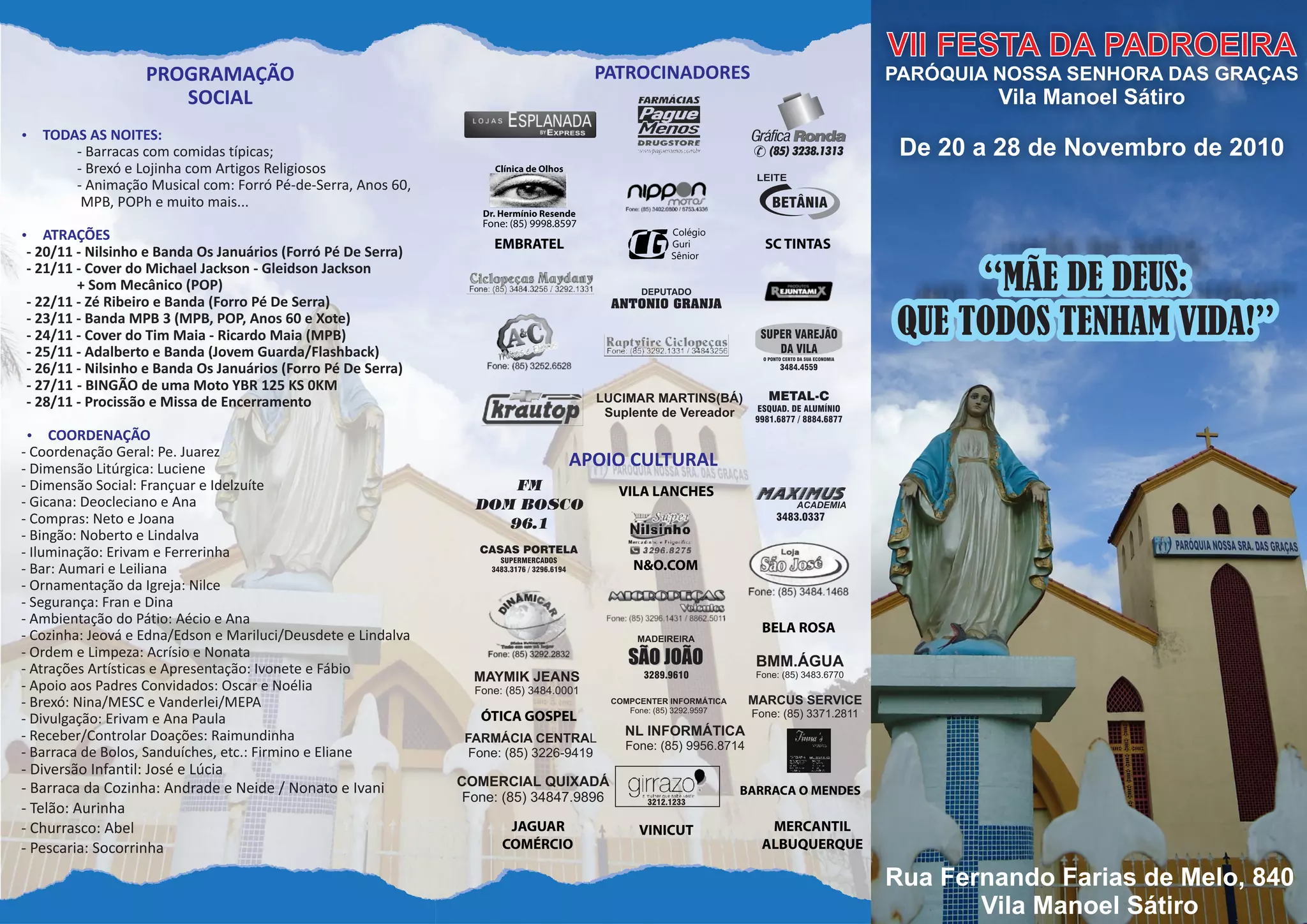 Este documento fornece a programação da VII Festa da Padroeira da Paróquia Nossa Senhora das Graças em Vila Manoel Sátiro de 20 a 28 de Novembro de 2010, incluindo atrações musicais, barracas, missas e procissão final.