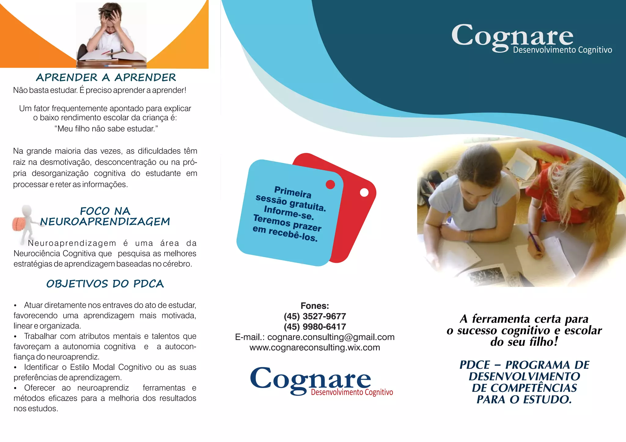 O documento descreve um programa de desenvolvimento de competências para o estudo chamado PDCE oferecido pela Cognare Consulting. O PDCE tem duração de 10 sessões e ensina competências essenciais para a autonomia cognitiva como planejamento de estudos, métodos e técnicas de aprendizagem e identificação do próprio estilo de aprendizagem. O programa é indicado para crianças a partir de 8 anos e busca melhorar os resultados escolares.