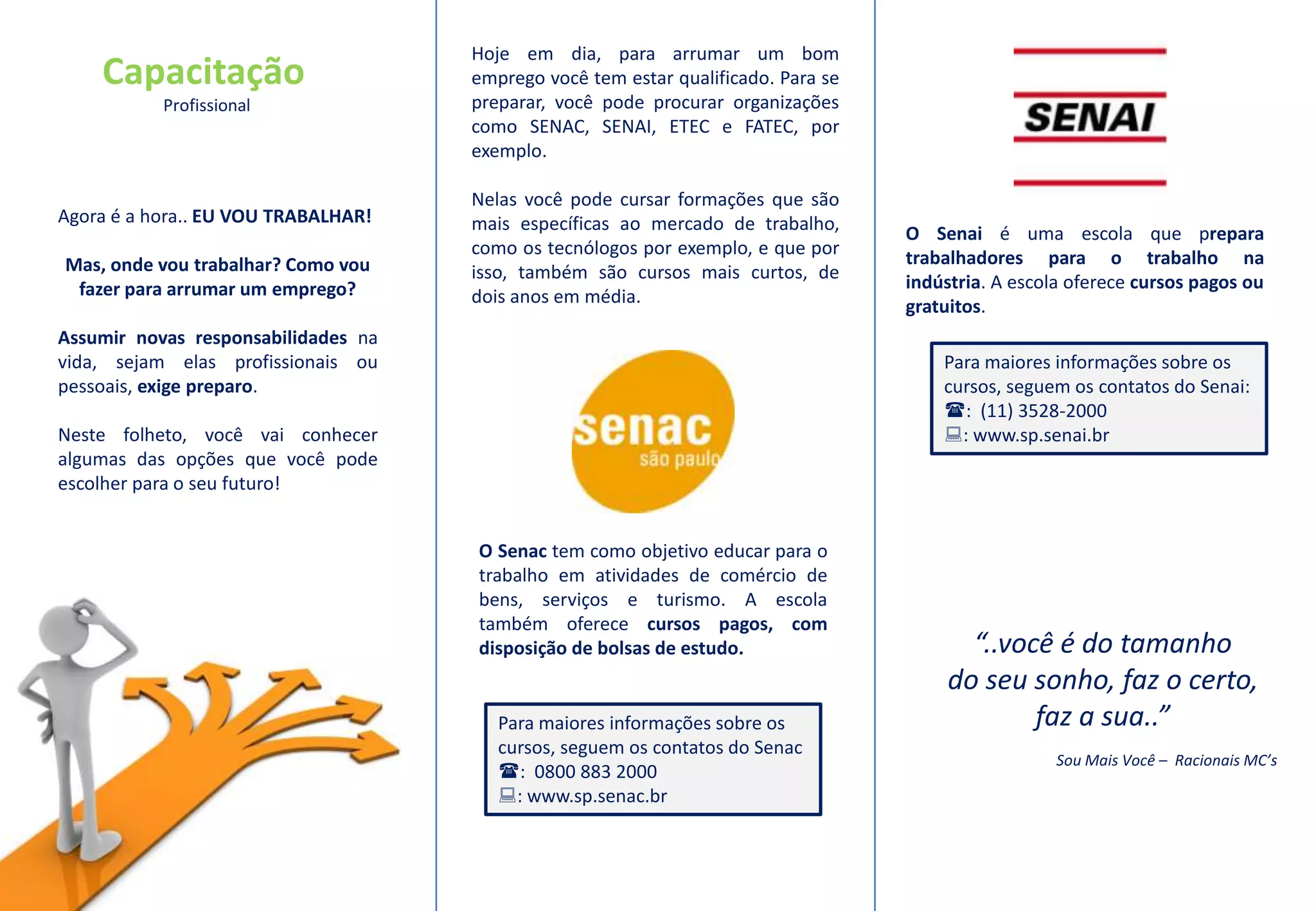 O documento discute opções de capacitação profissional como SENAI, SENAC, ETEC e FATEC que oferecem cursos técnicos específicos para o mercado de trabalho. Também menciona o SEBRAE que oferece cursos e apoio para quem deseja abrir seu próprio negócio. Por fim, fornece contatos das escolas ETEC e FATEC para mais informações.