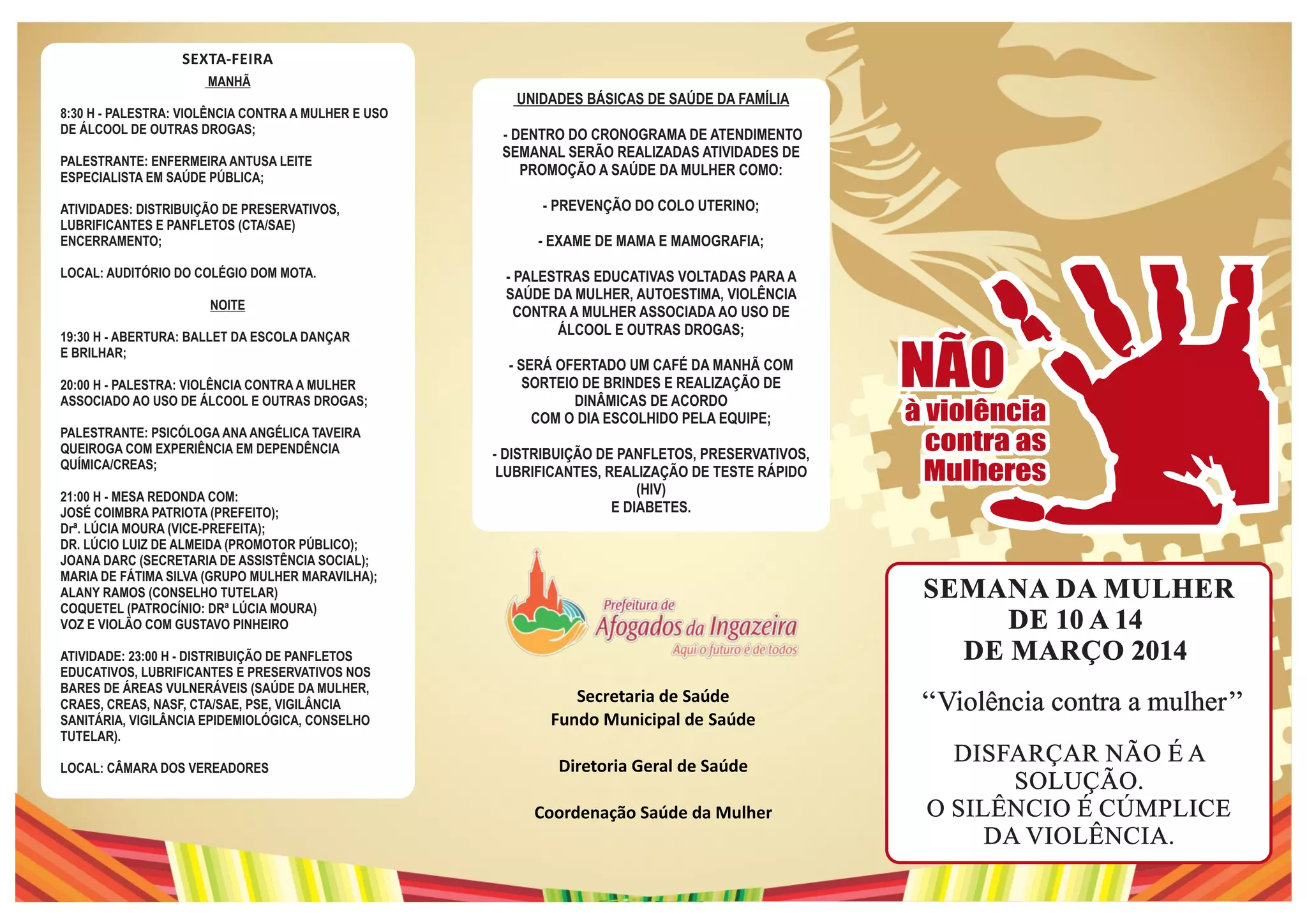 O documento descreve as atividades planejadas durante a Semana da Mulher de 10 a 14 de março de 2014 em uma cidade, incluindo palestras sobre violência contra a mulher e uso de álcool, distribuição de preservativos, atividades educativas em escolas e unidades de saúde, e testes rápidos de HIV.