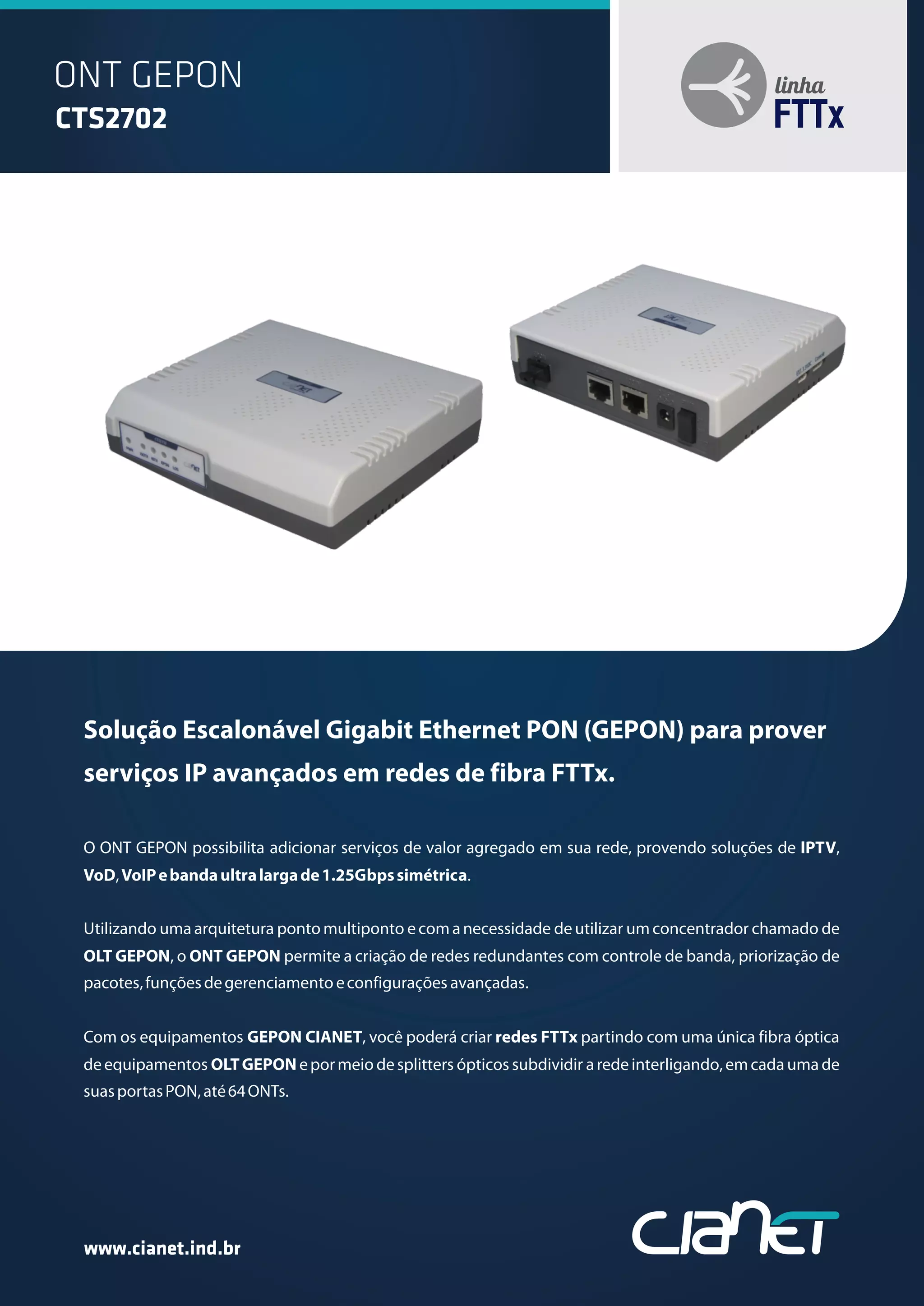 O documento descreve uma solução Gigabit Ethernet PON (GEPON) para fornecer serviços IP avançados em redes FTTx usando o ONT GEPON CTS2702. O ONT suporta serviços como IPTV, VoD, VoIP e banda larga de 1.25Gbps simétrica e permite a criação de redes redundantes com gerenciamento e configurações avançadas.