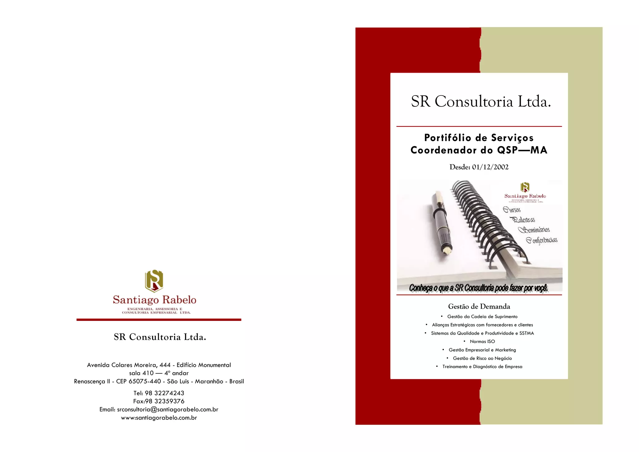 A SR Consultoria Ltda. oferece uma ampla gama de serviços, incluindo gestão da cadeia de suprimentos, consultoria em normas ISO e gestão de risco ao negócio, com foco em melhorias de produtividade e parcerias estratégicas. A equipe é composta por profissionais especializados em diversas áreas, proporcionando treinamentos e diagnósticos empresariais. A consultoria atua tanto no Brasil quanto em alguns países da América Latina, buscando soluções sustentáveis para seus clientes.