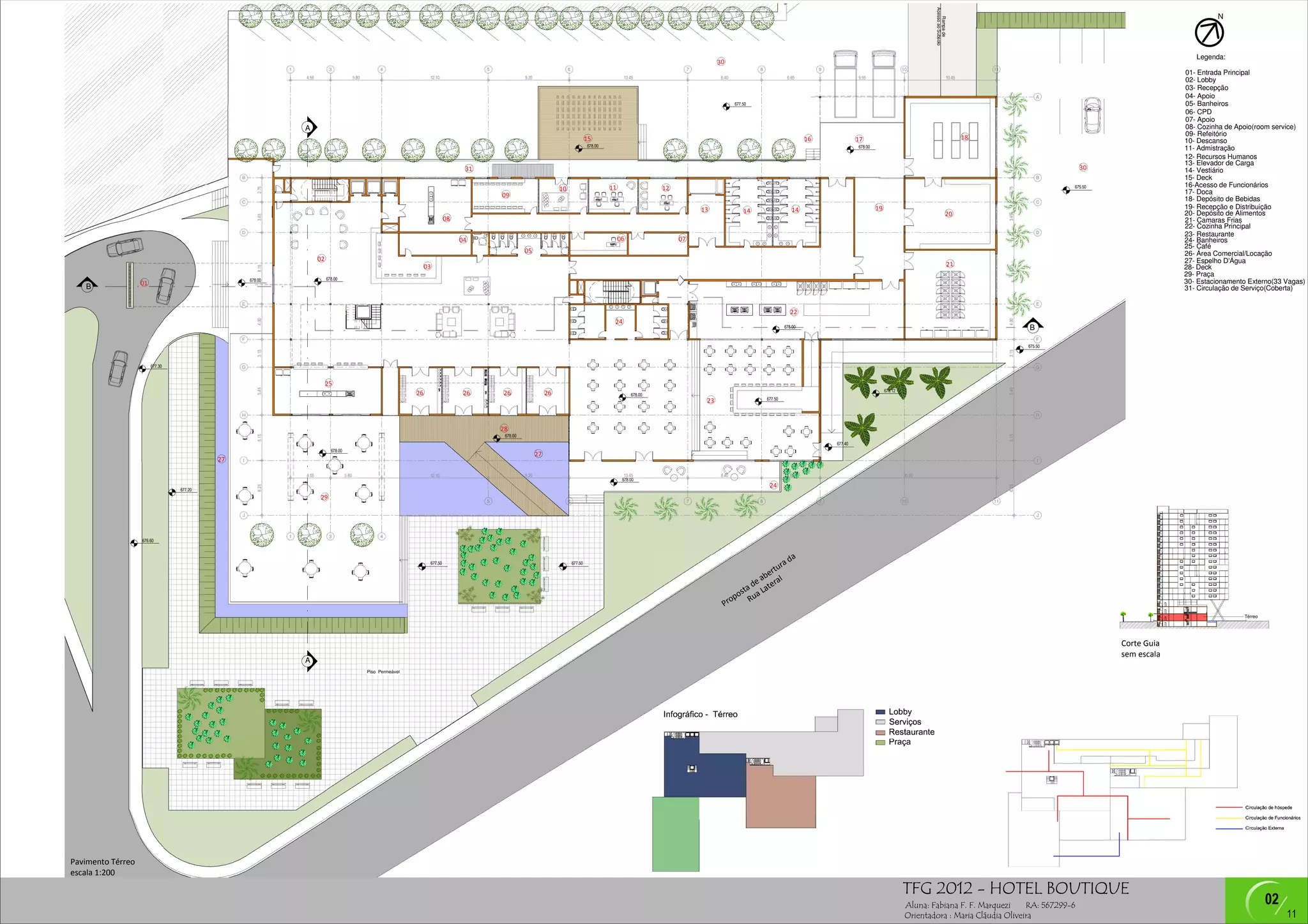 1) O documento apresenta os planos do térreo de um prédio, incluindo a localização de salas como recepção, cozinha, refeitório, escritórios e estacionamento.