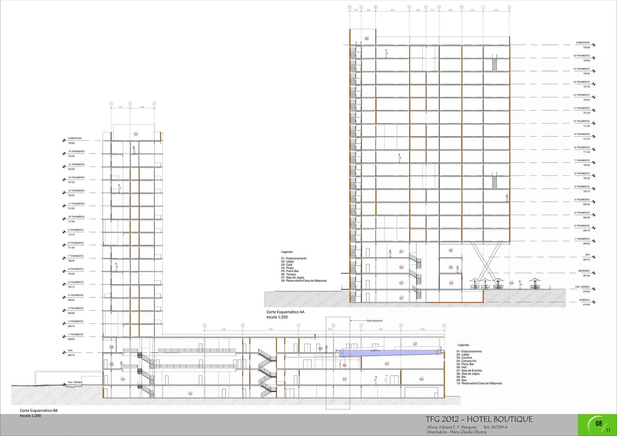 O documento apresenta desenhos de cortes e plantas de um prédio de 15 andares. As plantas mostram os diferentes níveis do prédio e identificam salas como estacionamento, lobby e terraço. Os cortes exibem as alturas dos pisos e identificam recursos como spa e reservatório.