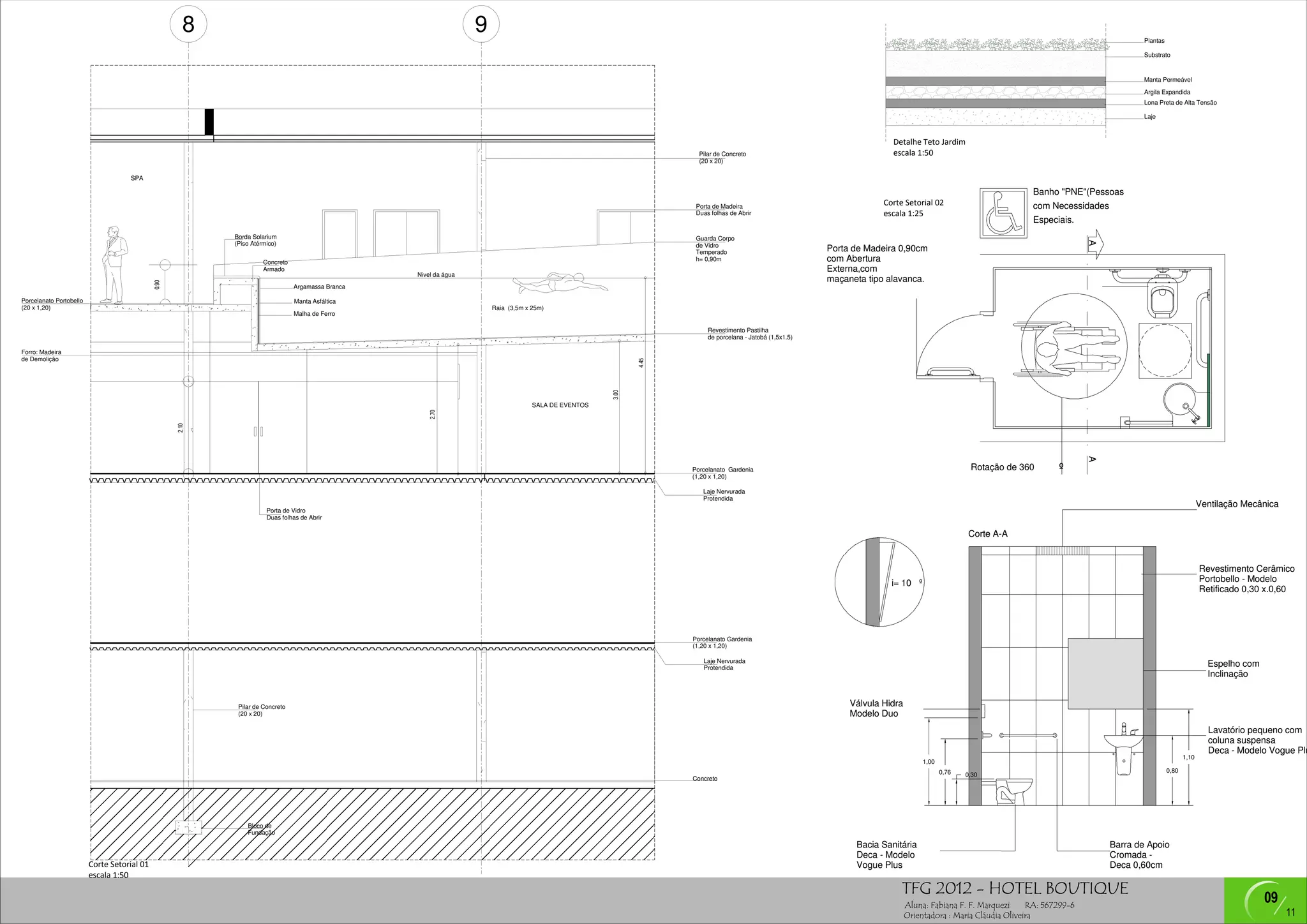 1) O documento apresenta os detalhes arquitetônicos de um projeto que inclui uma sala de eventos, spa e solarium.