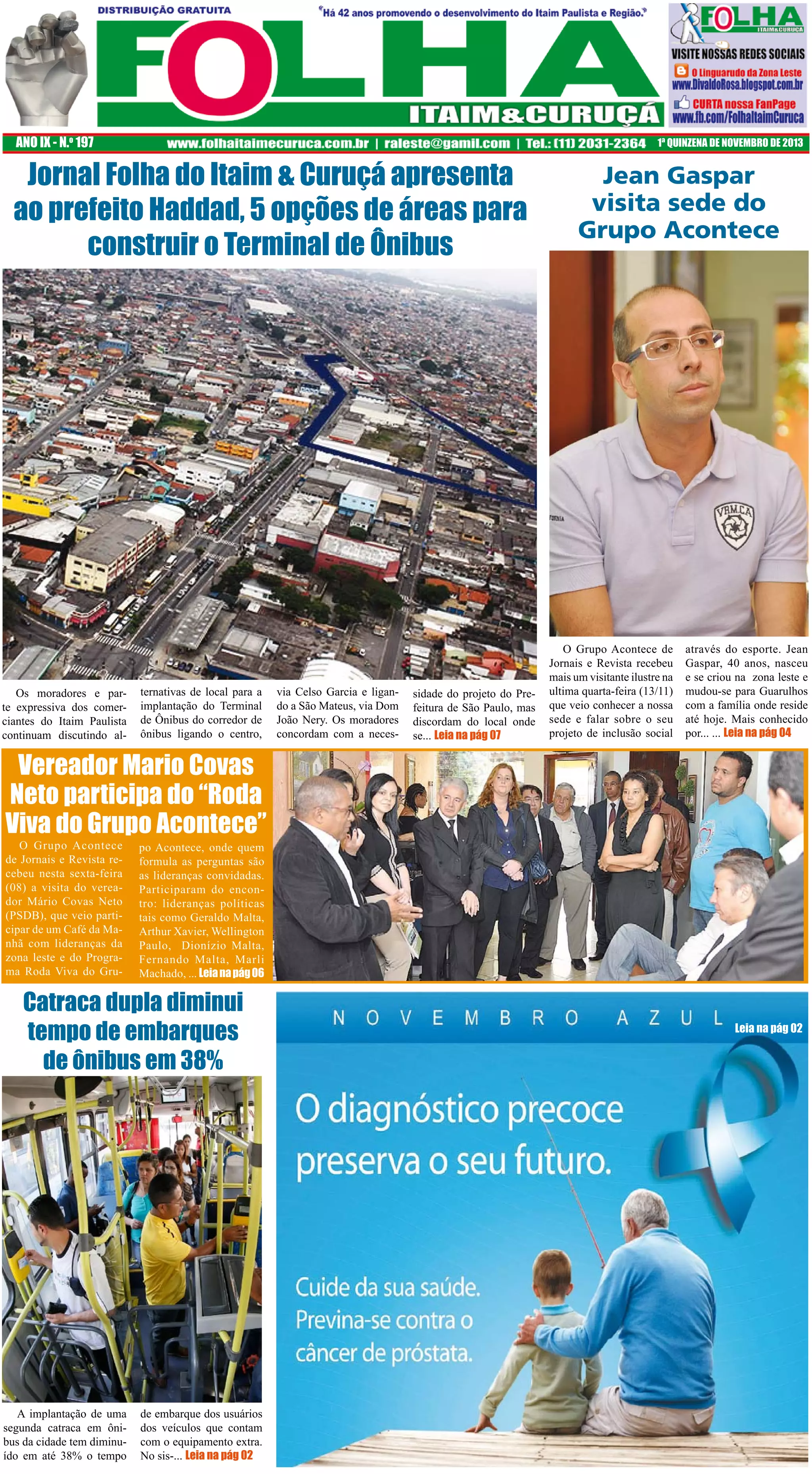 O jornal apresenta 5 opções de áreas para construir o Terminal de Ônibus do Itaim Paulista e discute alternativas com moradores. O vereador Mário Covas Neto participa de programa do Grupo Acontece. A instalação de uma segunda catraca em ônibus reduz o tempo de embarque em até 38%.