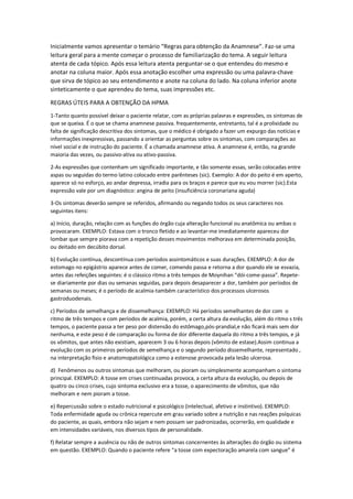 1) A anamnese deve permitir que o paciente fale espontaneamente sobre os sintomas, mas o médico pode precisar interferir para orientar as perguntas caso o relato seja prolixo ou falta de significado. 2) É importante registrar expressões ou frases do paciente que fornecem indícios diagnósticos, colocando-as entre aspas ou seguidas de "(sic)". 3) Os sintomas devem ser caracterizados quanto a início, duração, fatores de melhora ou piora, evolução contínua ou descontínua,