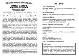 O documento reflete sobre como vivemos obcecados pelos valores materiais e efémeros em vez dos valores eternos do Reino de Deus. A liturgia usa a imagem do "banquete" para descrever a felicidade eterna que Deus oferece. A comunidade cristã deve aceitar o convite de Deus para viver em comunhão com Ele, como a comunidade de Filipos.