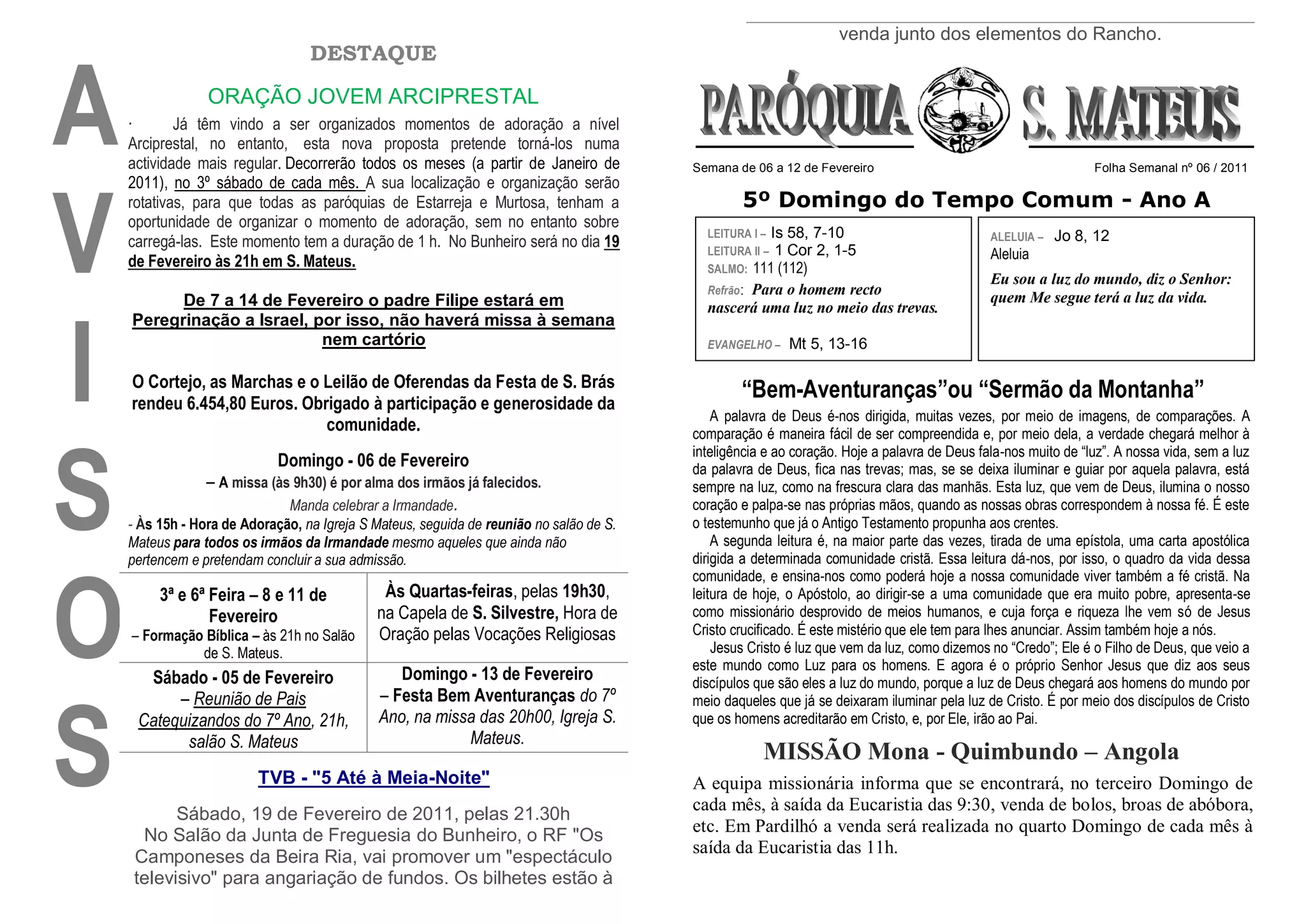 Este documento anuncia vários eventos religiosos e comunitários em Estarreja e Murtosa, incluindo orações mensais rotativas entre paróquias, formação bíblica, venda de bolos para angariar fundos para missões em Angola, e um "espectáculo televisivo" para arrecadar mais fundos.