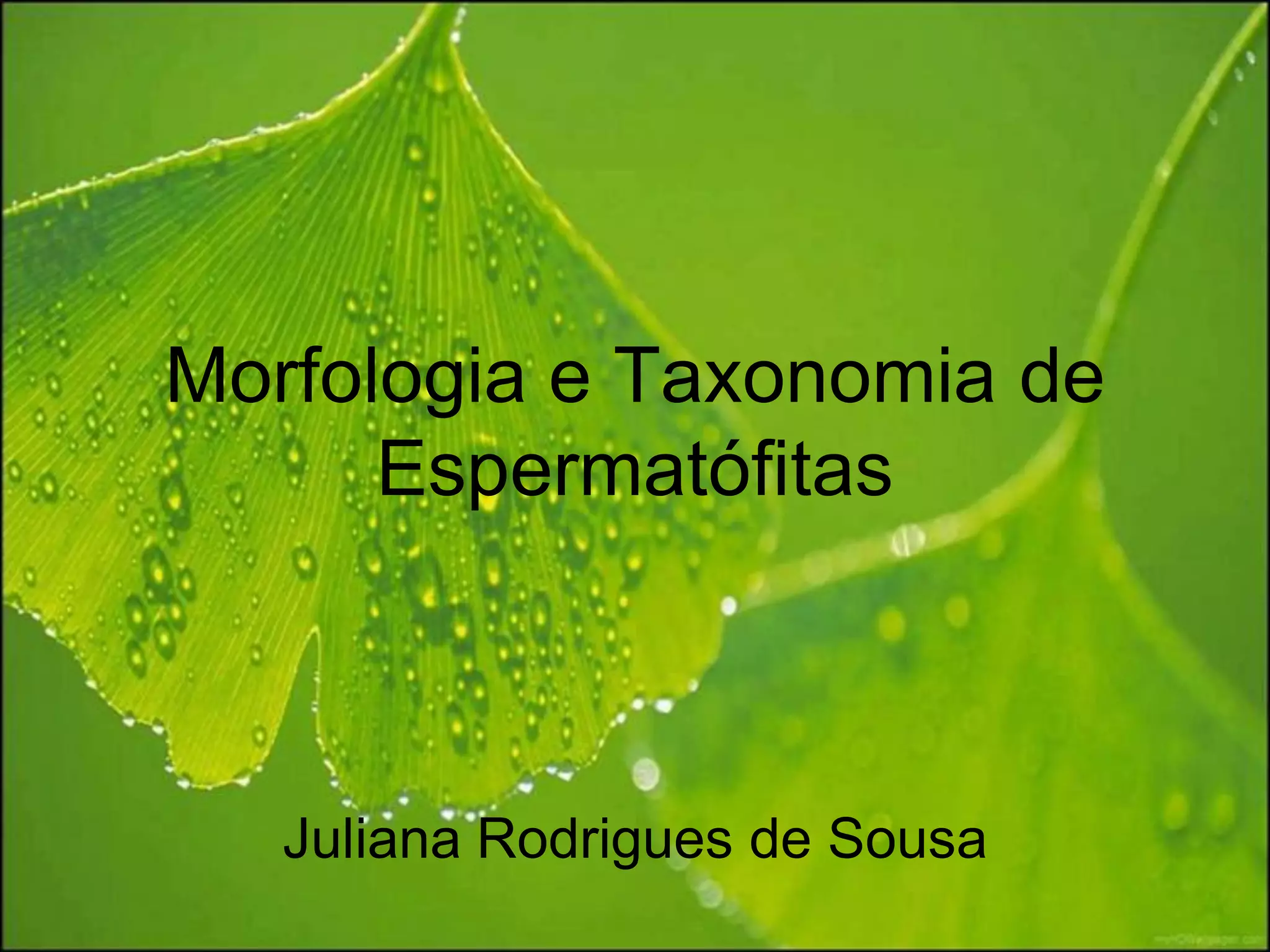 O documento discute as características morfológicas e taxonomia das folhas de espermatófitas. As folhas desempenham funções importantes como a fotossíntese e respiração e apresentam características como forma, tamanho, nervuras e textura que variam entre as espécies. O documento descreve a estrutura, nomenclatura, filotaxia e tipos de folhas como simples e compostas.