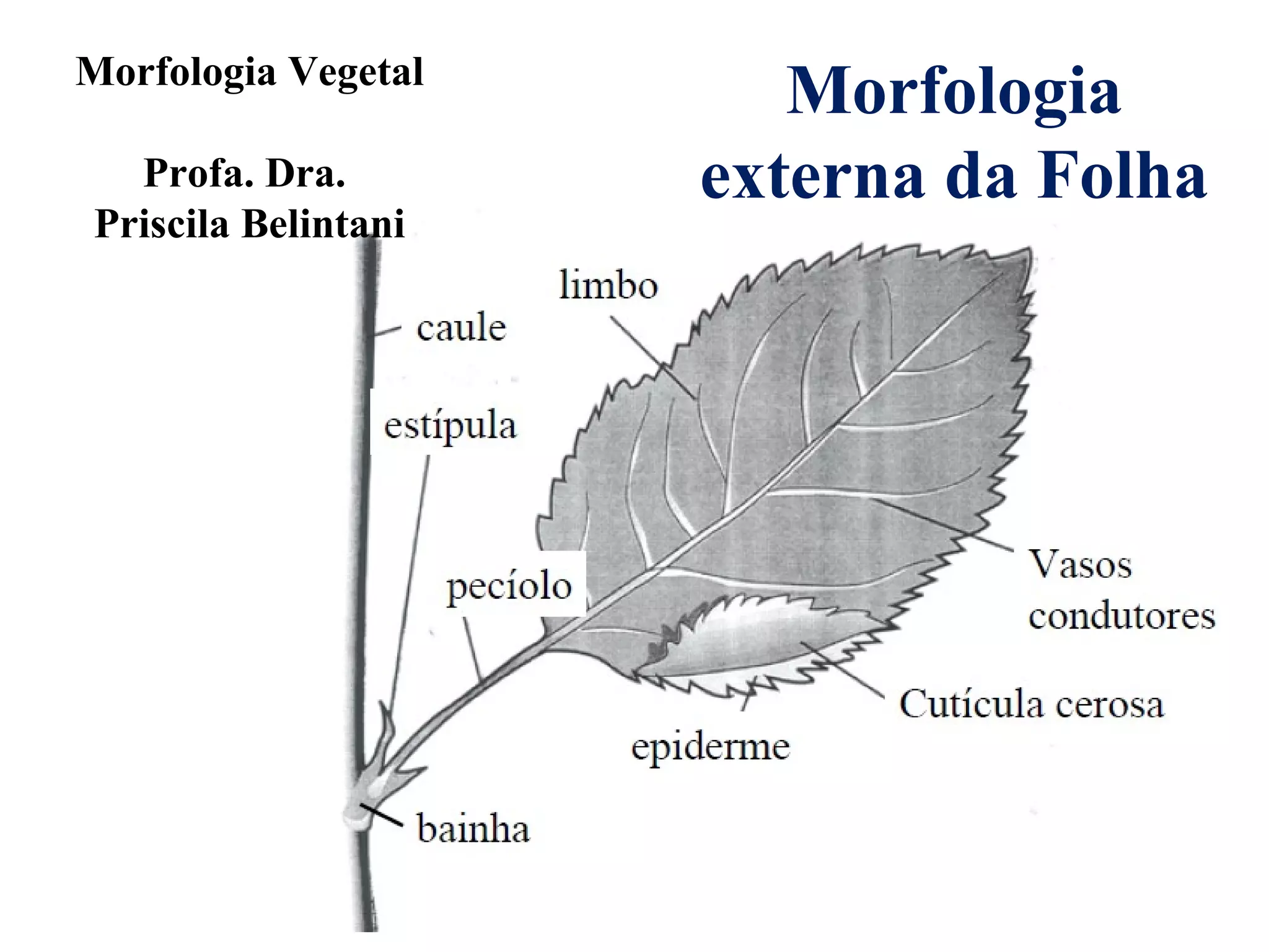 Este documento descreve a morfologia externa da folha, incluindo suas funções, partes, tipos, modificações, simetria, filotaxia, venação, forma, margem e indumento. Detalha as características das folhas simples e compostas, bem como estruturas associadas como pecíolo, bainha, estípulas e modificações foliares.