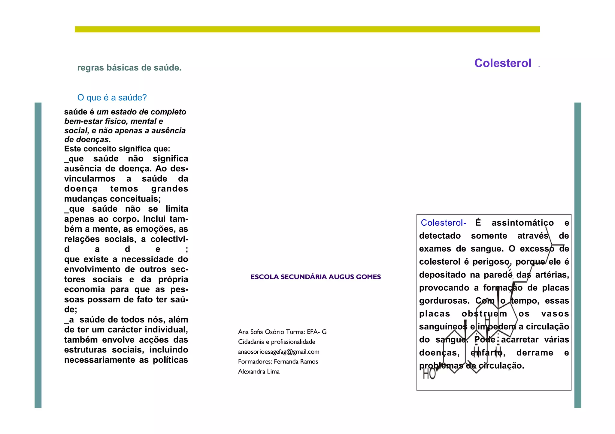 O documento discute o conceito de saúde e seus principais aspectos. Saúde é definida como um estado completo de bem-estar físico, mental e social, não se limitando apenas à ausência de doenças. O documento também aborda o colesterol, um fator de risco cardiovascular assintomático que pode levar a problemas de saúde se em excesso.