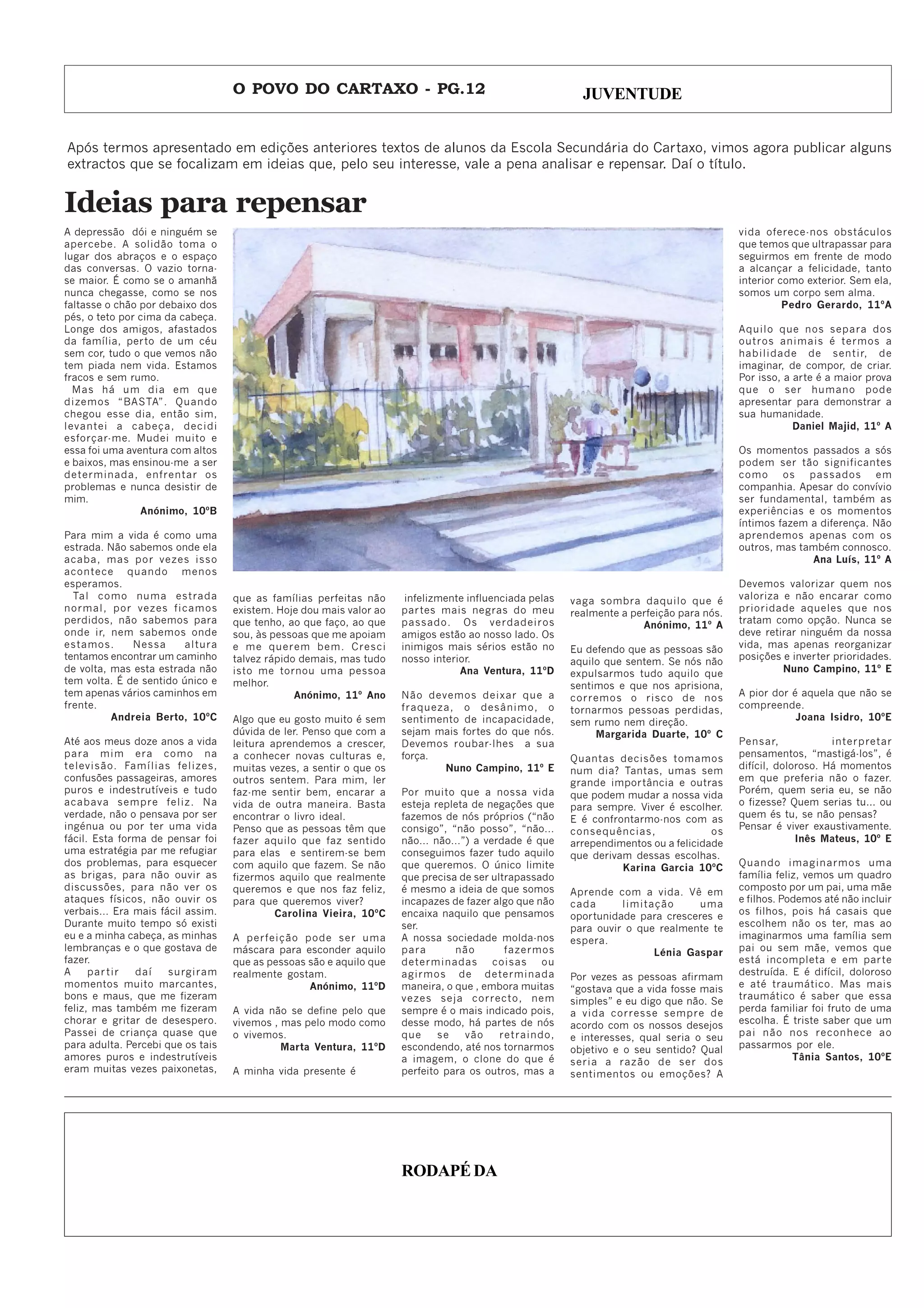Este documento apresenta excertos de alunos da Escola Secundária do Cartaxo sobre ideias relacionadas à juventude. Os alunos discutem tópicos como depressão, solidão, determinação, arte, momentos a sós, valorização de relacionamentos, tomada de decisões, reflexão, e conceitos de família e perfeição. Os excertos fornecem perspectivas pessoais e reflexivas sobre experiências de vida.