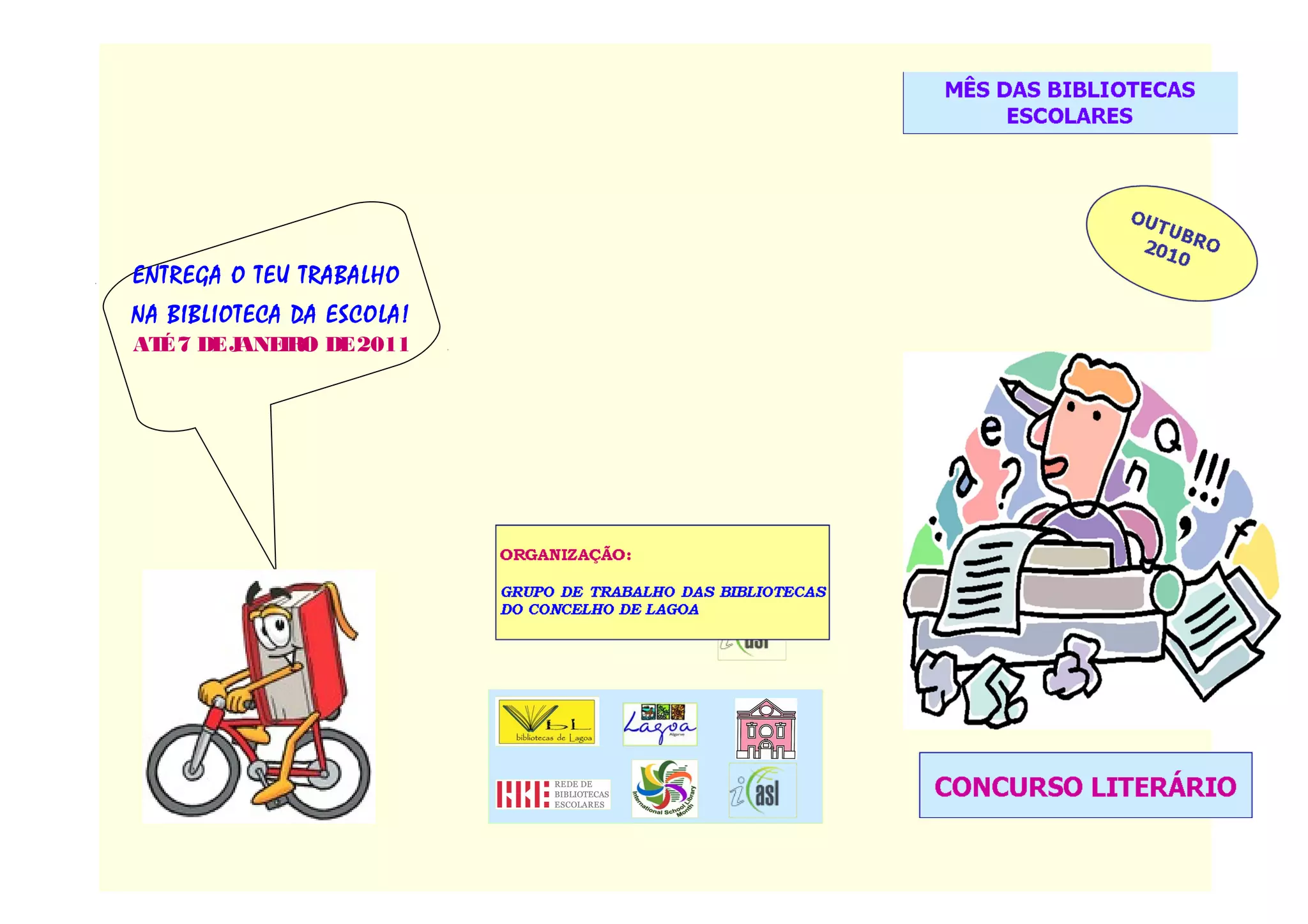 Este documento anuncia um concurso literário para estudantes de 1o, 2o, 3o ciclos e ensino secundário da cidade de Lagoa. O objetivo é desenvolver a capacidade de escrita das crianças e jovens. Os participantes devem entregar histórias originais até 7 de janeiro de 2011 nas bibliotecas escolares. Haverá prêmios para os vencedores de cada nível escolaridade.