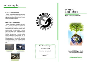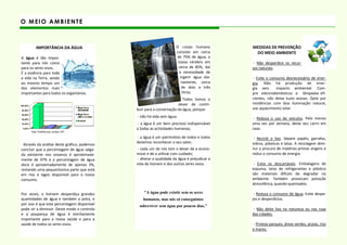 O documento discute a importância do meio ambiente e como os humanos prejudicam o meio ambiente através da poluição do ar, mar e solo. Ele também destaca a importância da água e medidas que as pessoas podem tomar para prevenir a poluição e proteger o meio ambiente, como reciclar, reduzir o consumo de energia e água, e evitar o desperdício.