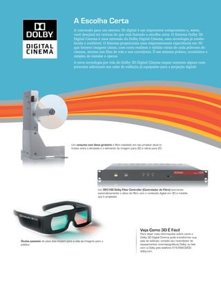 O documento descreve as vantagens do sistema Dolby 3D Digital Cinema para exibição de filmes em 3D no cinema. O sistema oferece imagens nítidas e realistas em 3D com instalações menos complexas em comparação a sistemas anteriores, proporcionando uma experiência imersiva para o público.