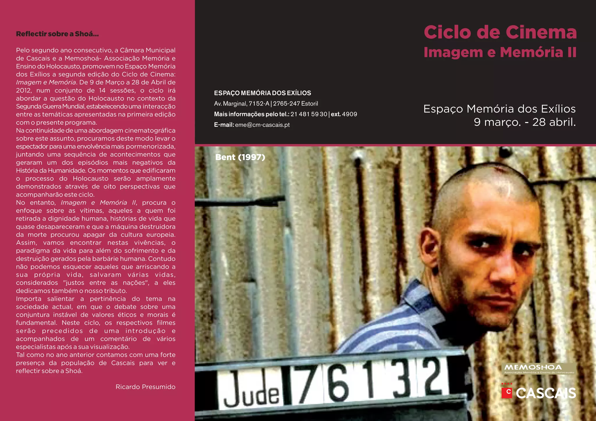 Este documento descreve o segundo ciclo de cinema "Imagem e Memória" promovido pela Câmara Municipal de Cascais e a Memoshoá - Associação Memória e Ensino do Holocausto no Espaço Memória dos Exílios entre 9 de Março e 28 de Abril de 2012. O ciclo inclui 14 sessões de filmes sobre o Holocausto durante a Segunda Guerra Mundial com o objetivo de levar o espectador a uma compreensão mais detalhada deste período através de uma sequência de eventos e perspectivas diferentes.