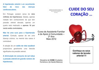 A hipertensão arterial é caracterizada por pressão arterial elevada, acima de 140/90 mmHg. Pode levar a complicações graves como acidente vascular cerebral e insuficiência cardíaca se não tratada. As principais causas incluem fatores genéticos, obesidade, sedentarismo, álcool e stress. Embora não tenha cura, geralmente pode ser controlada através de estilo de vida saudável e medicação.