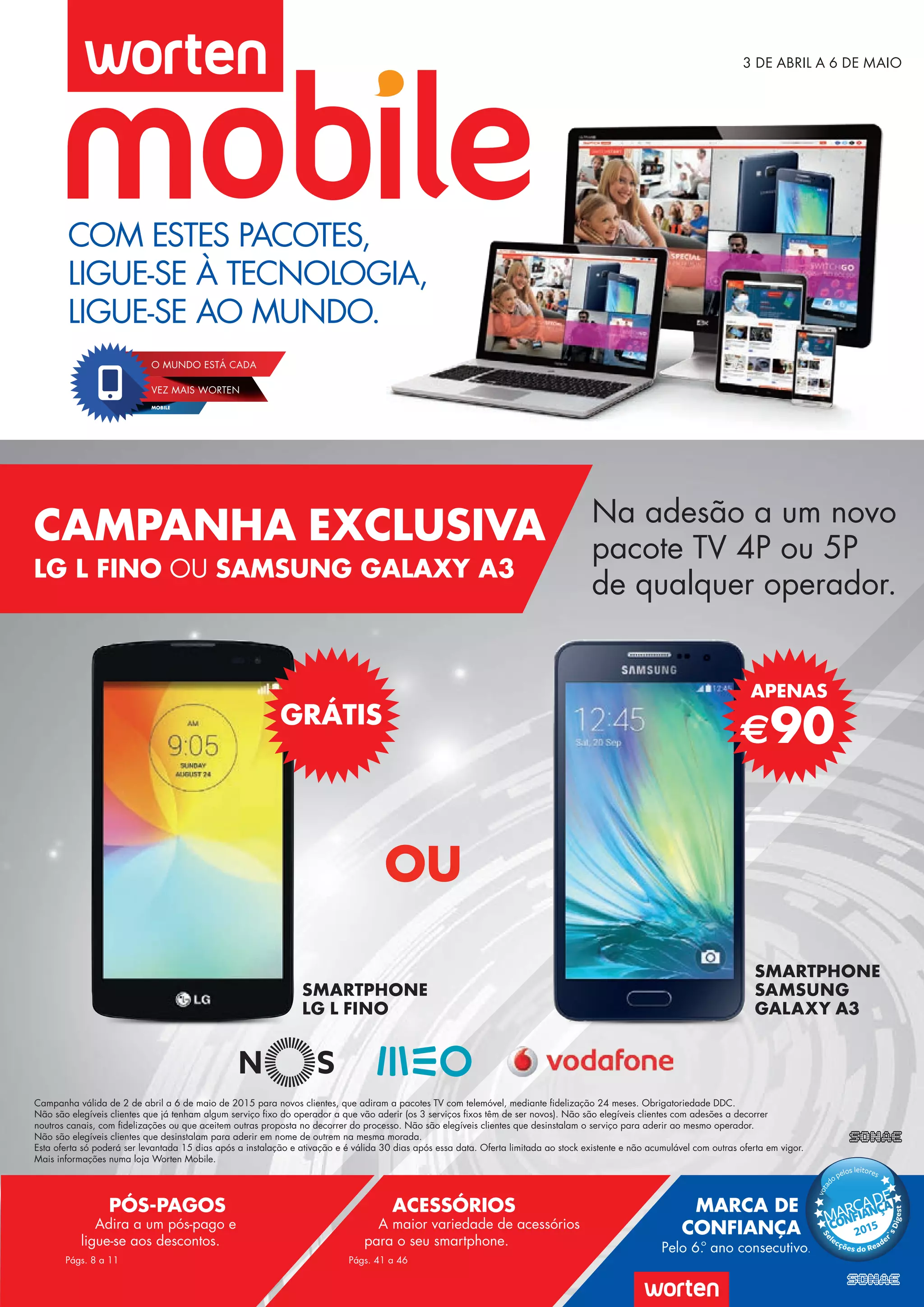Este documento apresenta ofertas de pacotes de telecomunicações de vários operadores, incluindo NOS, MEO, Vodafone e Worten Mobile, com informações sobre canais de TV, internet e voz fixa e móvel. Também inclui detalhes sobre smartphones à venda com descontos na adesão a tarifários pós-pagos.
