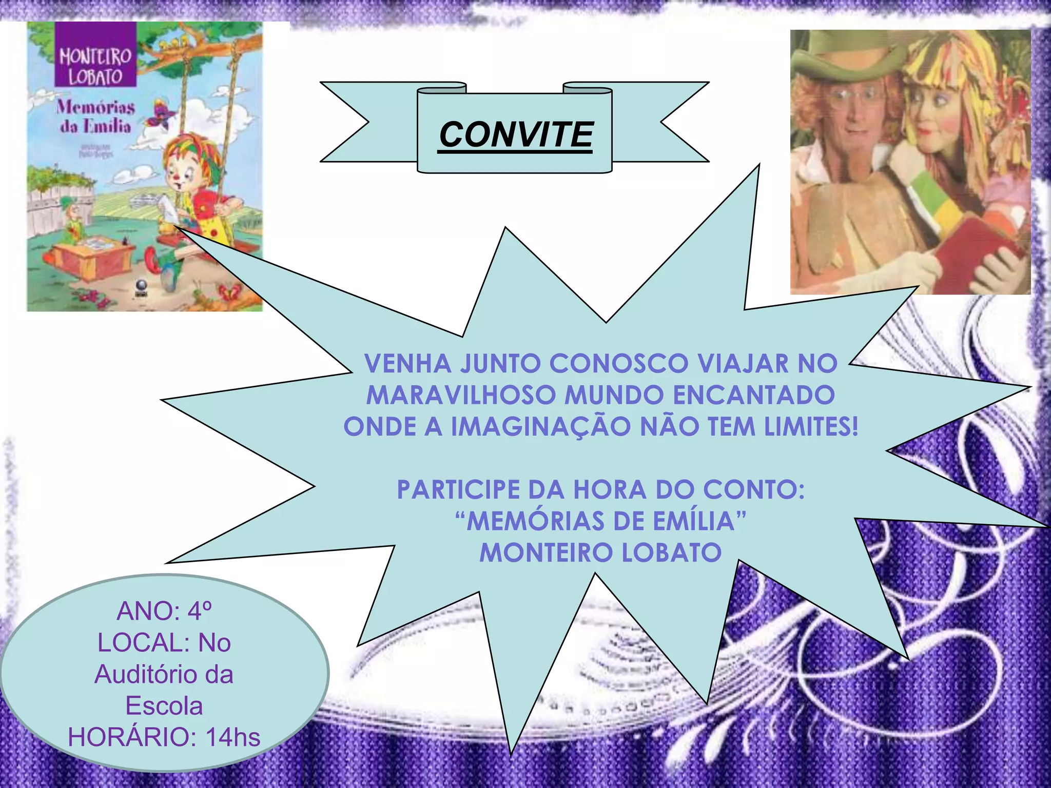 Convite para uma hora do conto sobre o livro "Memórias de Emília" de Monteiro Lobato na escola no auditório às 14h para alunos do 4o ano.