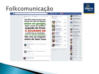 O documento discute a proposta inicial da folkcomunicação no Brasil, apresentada por Luiz Beltrão em 1965, que se referia ao processo de intercâmbio de informações e manifestações entre as classes marginalizadas através de agentes e meios ligados à cultura popular. O texto também descreve os principais métodos de pesquisa propostos para estudar a comunicação dessas classes, como análise de conteúdo de folhetos e jornais populares.