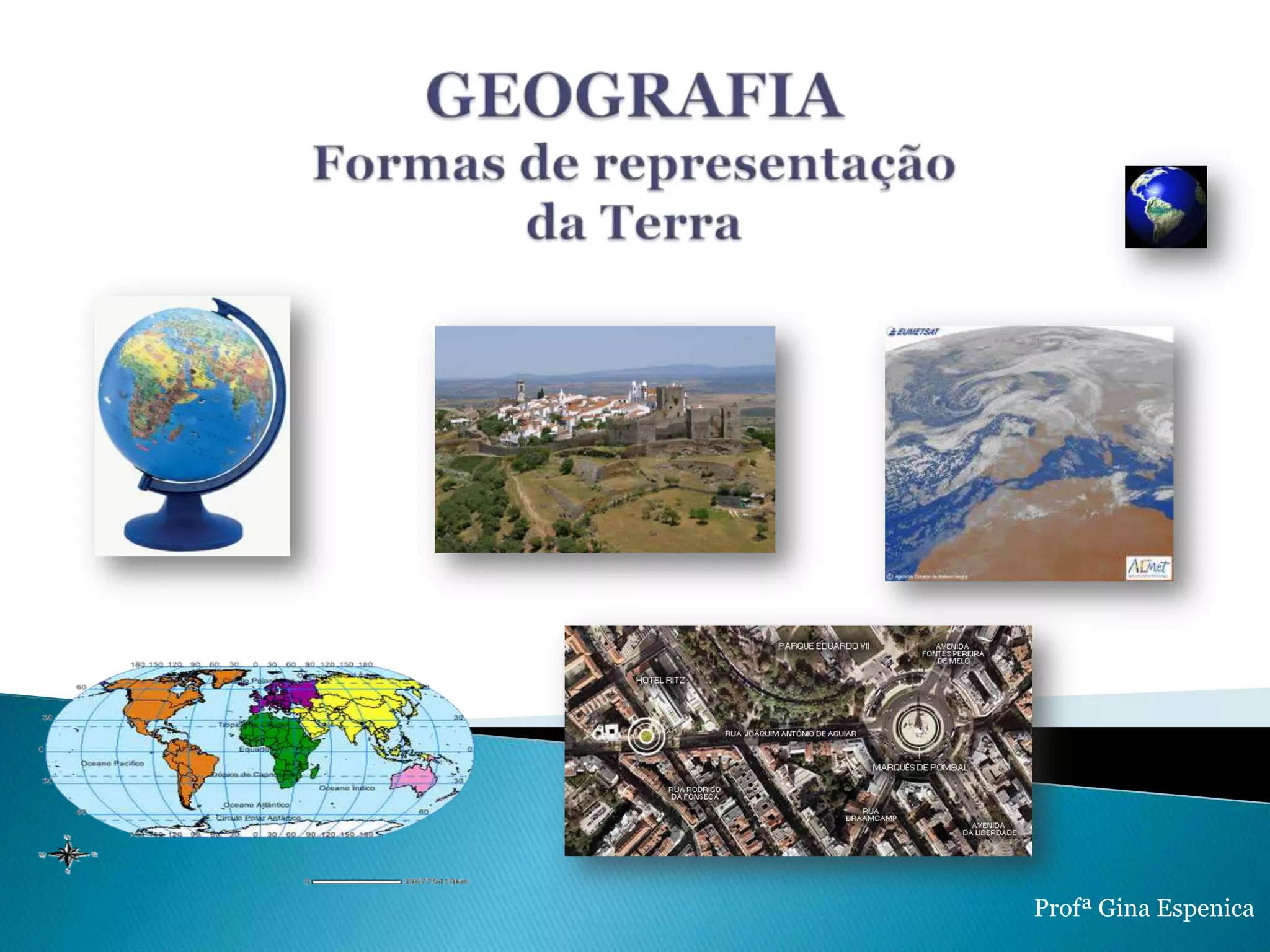 O documento descreve as principais formas de representação da Terra, incluindo globos, mapas, fotografias aéreas e imagens de satélite. Detalha os tipos de mapas de acordo com a extensão, número de temas, tema e escala representados, como mapas mundiais, corográficos, topográficos, gerais, temáticos, físicos, políticos e econômicos.
