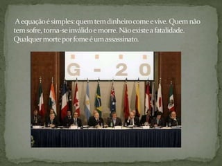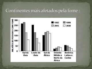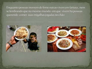 O documento discute como, apesar do desenvolvimento científico e tecnológico, a fome ainda afeta milhões de pessoas no mundo devido à má distribuição de riquezas. A fome causa sofrimento físico e é inaceitável em uma sociedade pensante, porém continua existindo no Brasil, especialmente no Nordeste, devido à concentração de terras e renda insuficiente.