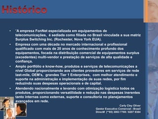 A Fonnet é uma empresa brasileira especializada na distribuição de equipamentos de telecomunicações excedentes, com uma década de experiência no setor e foco em serviços de alta qualidade. Oferece consultoria em gestão de inventário e logística otimizada, além de permitir o gerenciamento virtual do estoque pelos clientes. A empresa também possibilita a recuperação de investimentos por meio de contratos de consignação, compartilhando receitas provenientes da venda de equipamentos.