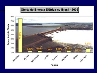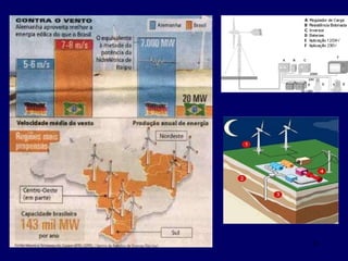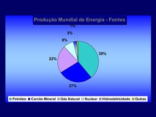 O documento discute as principais fontes de energia, sua história, tipos e características. Aborda os impactos da hidroeletricidade e a distribuição e consumo de energia elétrica no Brasil, incluindo desafios como a exclusão e desperdício.