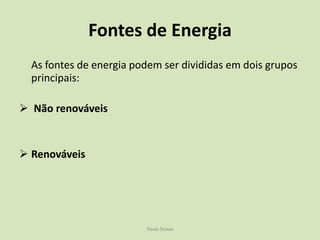 O documento discute as fontes de energia, dividindo-as em renováveis e não renováveis. As fontes não renováveis como combustíveis fósseis e energia nuclear possuem recursos limitados, enquanto as fontes renováveis como a energia solar, eólica e hidrelétrica possuem recursos que se regeneram naturalmente. O documento também aborda a importância da eficiência energética no uso e distribuição de energia.