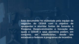 O documento apresenta diversas fontes de fomento à pesquisa, desenvolvimento e inovação disponíveis para o CESAR e seus parceiros, incluindo programas como BNDES Funtec, Embrapii, Inovar Auto e leis de incentivo fiscal como a Lei do Bem e a Lei de Informática. Cada fonte possui critérios específicos de participação, itens financiáveis e benefícios fiscais, com foco em áreas tecnológicas e industriais. O objetivo é promover a inovação e competitividade no setor por meio do apoio a projetos de PD&I.